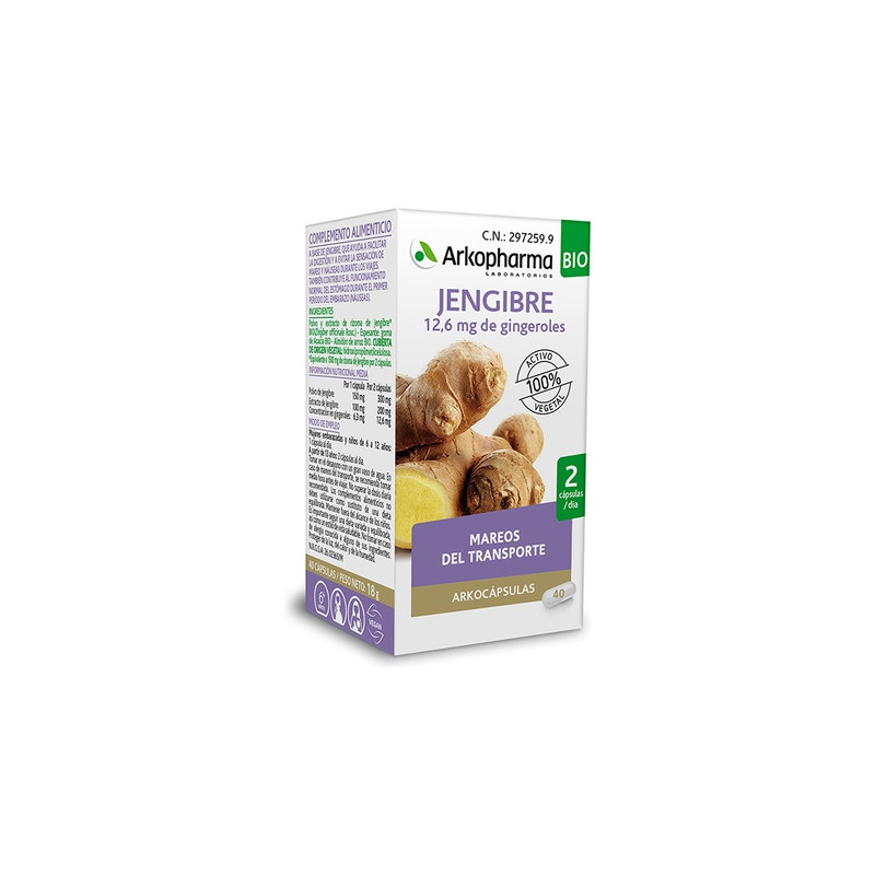 Arkocápsulas® Jengibre BIO es un complemento alimenticio especialmente diseñado para las personas que desean mejorar su digestión o que se marean cuando viajan.
