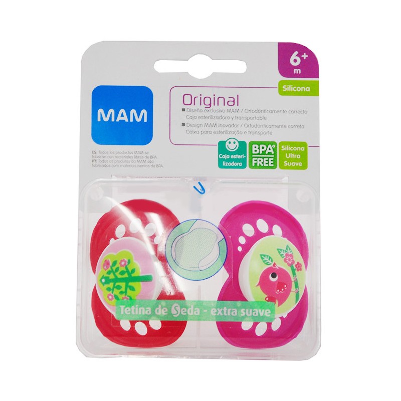 Esta tetina fisiológica de silicona está indicada para bebés de mas de seis meses. Es un chupete ortodóntico, lo que significa que tiene una forma asimétrica, similar a la que adquiere en pezón materno mientras el bebé está mamando. Es mas cómoda por su forma curvada del disco, es buena para la piel gracias a sus orificios de ventilación y a la superficio interior de MAM. El botón se elige facilmente y no molesta. La tetina es correcta para el desarrollo de la mandííbula y los dientes del bebé.