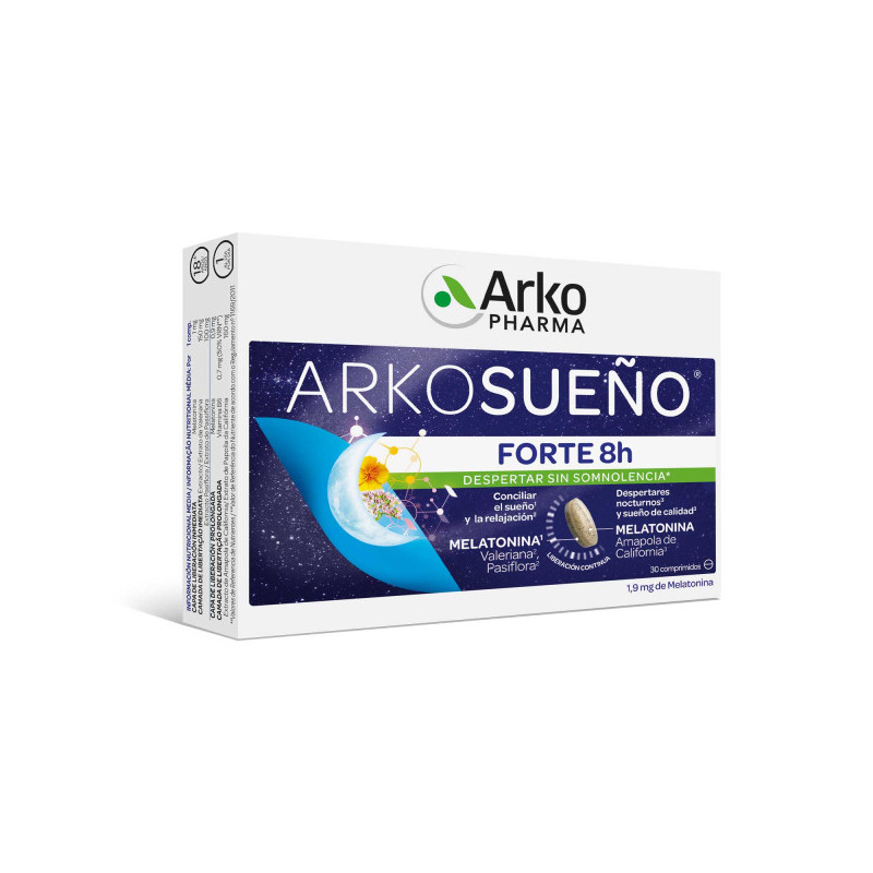 Arkosueño® Forte 8h libera melatonina en dos fases: Una liberación inmediata de Melatonina (1mg) para conciliar el sueño y (0,9mg) de liberación durante la noche para evitar los despertares nocturnos.